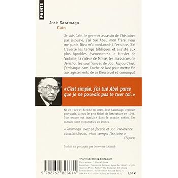 Je suis Caïn, le premier assassin de l'histoire : par jalousie, j'ai tué Abel, mon frère. Pour me punir, Dieu m'a condamné à l'errance. J'ai traversé les temps bibliques et assisté aux plus ignobles événements : le brasier de Sodome, la colère de Moïse, les massacres de Jéricho, les souffrances de Job. Aujourd'hui, j'embarque dans l'arche de Noé pour mettre fin aux agissements de ce Dieu cruel et corrompu ! Né en 1922 et décédé en 2010, José Saramago était un écrivain portugais. Il a reçu le prix Nobel de littérature en 1988. Son œuvre est traduite dans le monde entier. Ses romans sont disponibles en Points. " Saramago, avec sa facétie et son irrévérence caractéristiques, vient corriger l'Histoire. "L'Express Traduit du portugais par Geneviève Leibrich