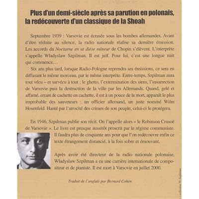 Ce livre est un document exceptionnel. Par son histoire d'abord publié en 1946 en Pologne, au lendemain de la défaite nazie, il fut presque aussitôt proscrit par le régime communiste d'alors. Il faudra plus de cinquante ans pour que les Polonais et le monde entier découvrent enfin ce témoignage hors du commun, poignant et sobre, récit d'un survivant du ghetto de Varsovie. Lorsque l'armée hitlérienne envahit la Pologne, Wladyslaw Szpilman est un jeune pianiste. Il vit avec ses parents et ses frères et soeurs à Varsovie et travaille pour Radio Pologne. La chute de la ville entre les mains allemandes fait basculer leur destin. Les portes du ghetto vont bientôt se refermer sur eux, et sur un demi-million de Juifs polonais, condamnés à l'esclavage, aux privations et à la mort. Szpilman raconte la vie quotidienne, qui continue jusqu'en 1942, les trahisons et les inégalités au sein de la communauté juive enfermée, puis les déportations méthodiques, la perte de sa famille, et la révolte du ghetto, sursaut d'une poignée de désespérés face à une armée allemande suréquipée. Il livre ici le récit halluciné d'une lutte pour la survie. --Maya Kandel