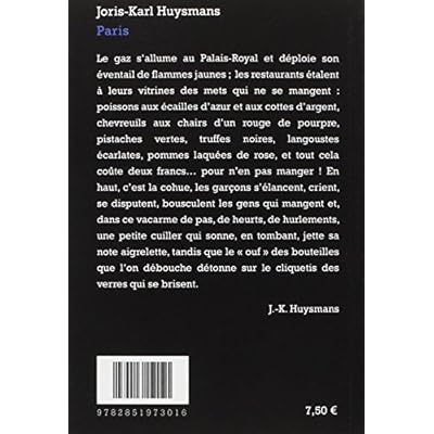 Le gaz s'allume au Palais-Royal et déploie son éventail de flammes jaunes ; les restaurants étalent à leurs vitrines des mets qui ne se mangent : poissons aux écailles d'azur et aux cottes d'argent, chevreuils aux chairs d'un rouge de pourpre, pistaches vertes, truffes noires, langoustes écarlates, pommes laquées de rose, et tout cela coûte deux francs... pour n'en pas manger ! En haut, c'est la cohue, les garçons s'élancent, crient, se disputent, bousculent les gens qui mangent et, dans ce vacarme de pas, de heurts, de hurlements, une petite cuiller qui sonne, en tombant, jette sa note aigrelette, tandis que le «ouf» des bouteilles que l'on débouche détonne sur le cliquetis des verres qui se brisent.
