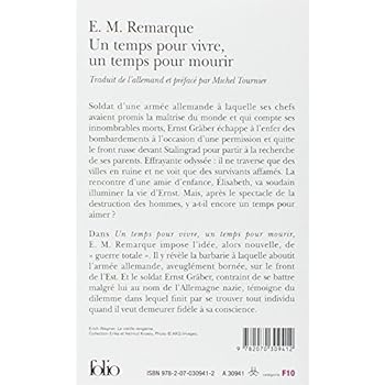 Soldat d'une armée allemande à laquelle ses chefs avaient promis la maîtrise du monde et qui compte ses innombrables morts, Ernst Gräber échappe à l'enfer des bombardements à l'occasion d'une permission et quitte le front russe devant Stalingrad pour partir à la recherche de ses parents. Effrayante odyssée : il ne traverse que des villes en ruine et ne voit que des survivants affamés. La rencontre d'une amie d'enfance, Elisabeth, va soudain illuminer la vie d'Ernst. Mais, après le spectacle de ladestruction des hommes, y a-t-il encore un temps pour aimer ? Dans Un temps pour vivre, un temps pour mourir, E. M. Remarque impose l'idée, alors nouvelle, de " guerre totale ". Il y révèle la barbarie à laquelle aboutit l'armée allemande, aveuglément bornée, sur le front de l'Est. Et le soldat Ernst Gräber, contraint de se battre malgré lui au nom de l'Allemagne nazie, témoigne du dilemme dans lequel finit par se trouver tout individu quand il veut demeurer fidèle à sa conscience.